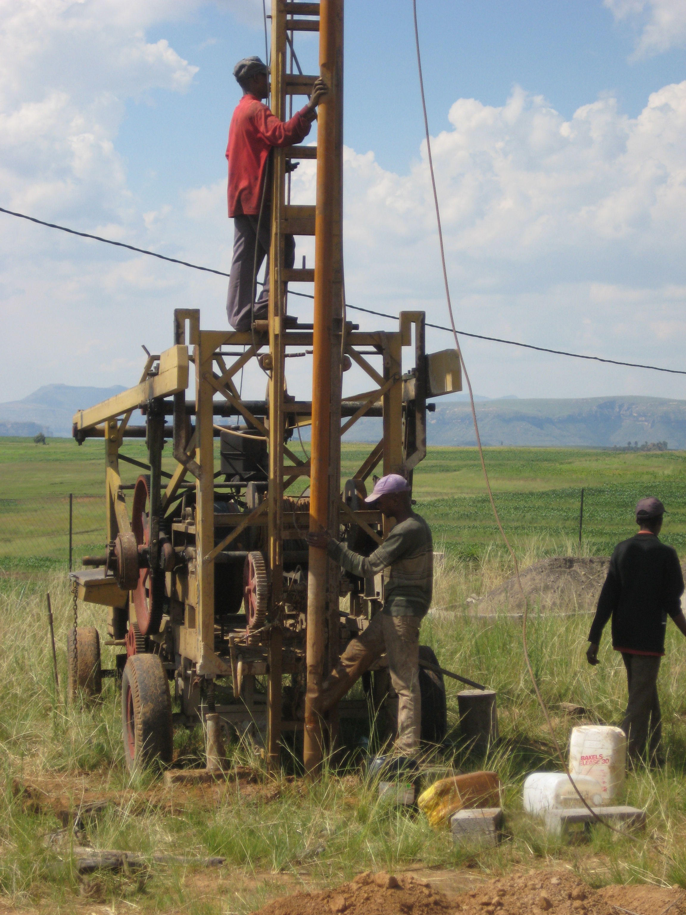 The machine that is digging for our water supply is still noisily and busily working away at the bore hole, which has passed the 30 meter mark. It’s slow going, but the various colors of mud which are pulled from the hole indicate the progress we’re making through the different layers of soil and stone standing between us and the underground water source we seek. When we stopped by the base this morning to bring more water and check the progress this morning, they said they’d reached a small amount of water! This means it won’t be long before they reach a sufficient water source, and they can stop disturbing our poor neighbors with the noisy drilling. Once the hole is finished, they will insert a metal casing to protect the hole from caving in on itself. From there we will need to purchase an electric pump to pump the water out of the hole, a water tank and tall stand for the water to be pumped into, and all the other pipes and pieces needed. We need about R25,000 ($3000) for the complete water system which will supply the house and other (future) structures at the base with running water. Want to slake the thirst?? Go to our donate page and give today!