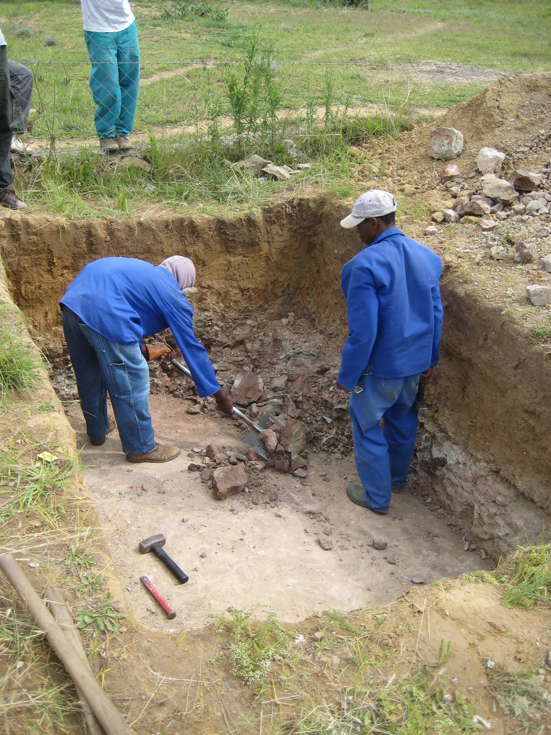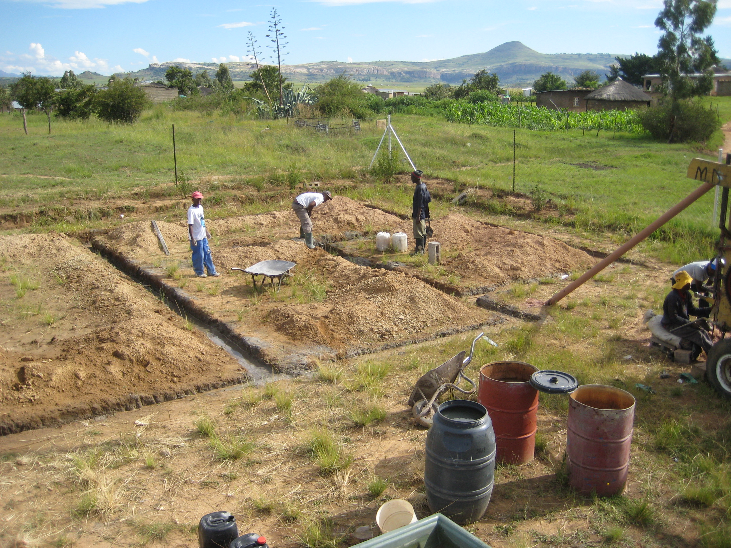 Last Saturday the construction crew began to pour the cement foundation in the foundation trench, and returned to complete it on Monday. For the foundation they used 25 bags of cement, about 7 cubic meters of rough sand, and more than 1,200 liters of water. Since we don’t have a source of water (yet) at the base, we have to take water containers to the local dam, fill them up with a bucket and funnel, then pour them into large drums at the base. It is a time consuming task to provide enough water Β for the bore hole machine and the construction crew working at the same time, but God has been helping us out in big ways! The night before the foundation was to be laid, it rained heavily. When we met the construction crew at the base the following morning, we saw that the trench was half full of water God has provided. That meant we only had to get about 1/4 of the water needed for the foundation! We really appreciated that provision miracle π Now that the foundation is laid, it has to settle for a week. On Monday the crew will come again and build the first layer of the foundation out of cinder blocks and cement, then let that settle for another week. After that they will start building the walls! We still need to purchase about R14,000 ($1,650) worth of building materials to complete the building of the walls (cement, cinder blocks, and window lentils). Know of anyone who has a passion for construction? Let them know about our project and how they can help us build the LXP house!